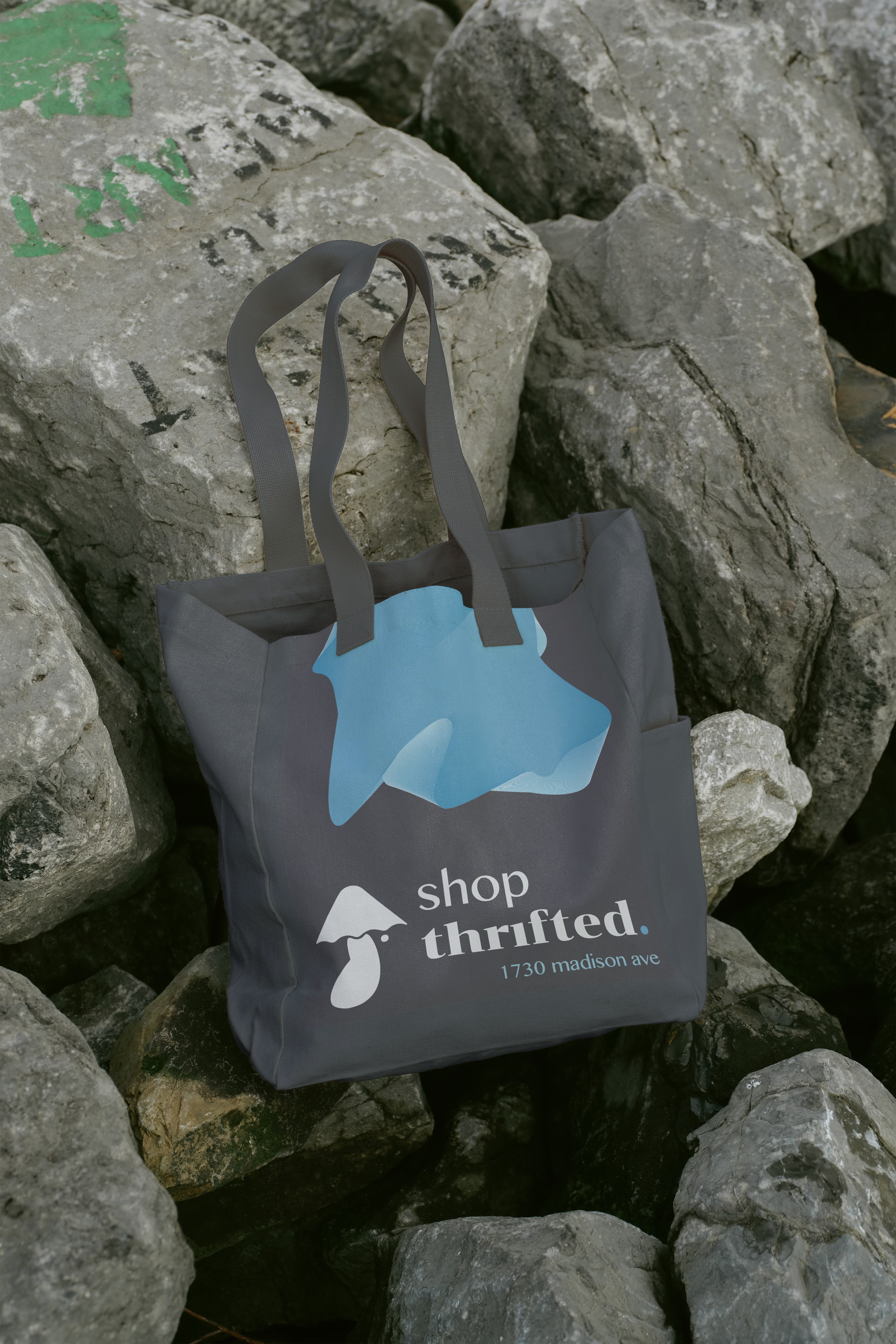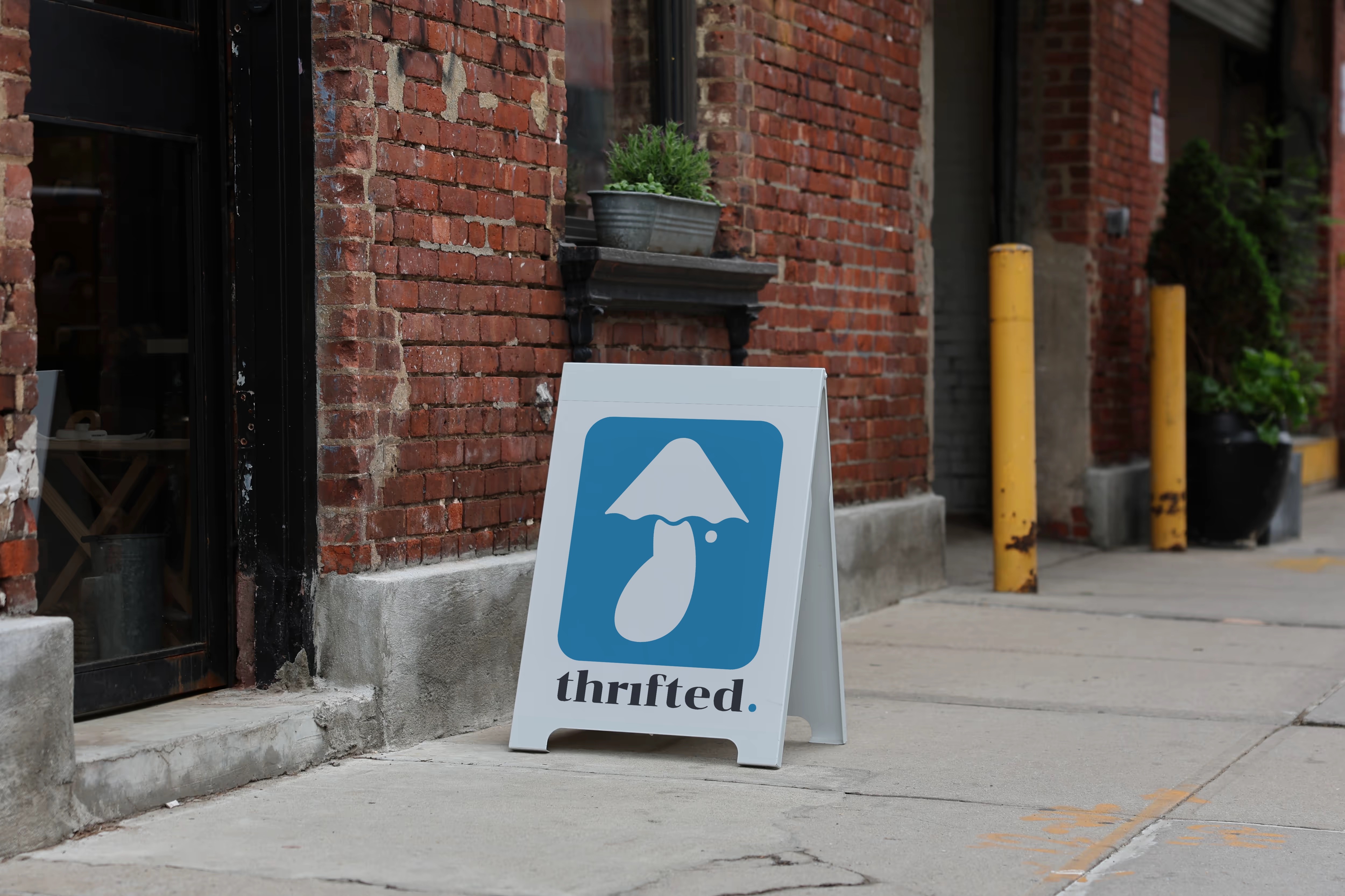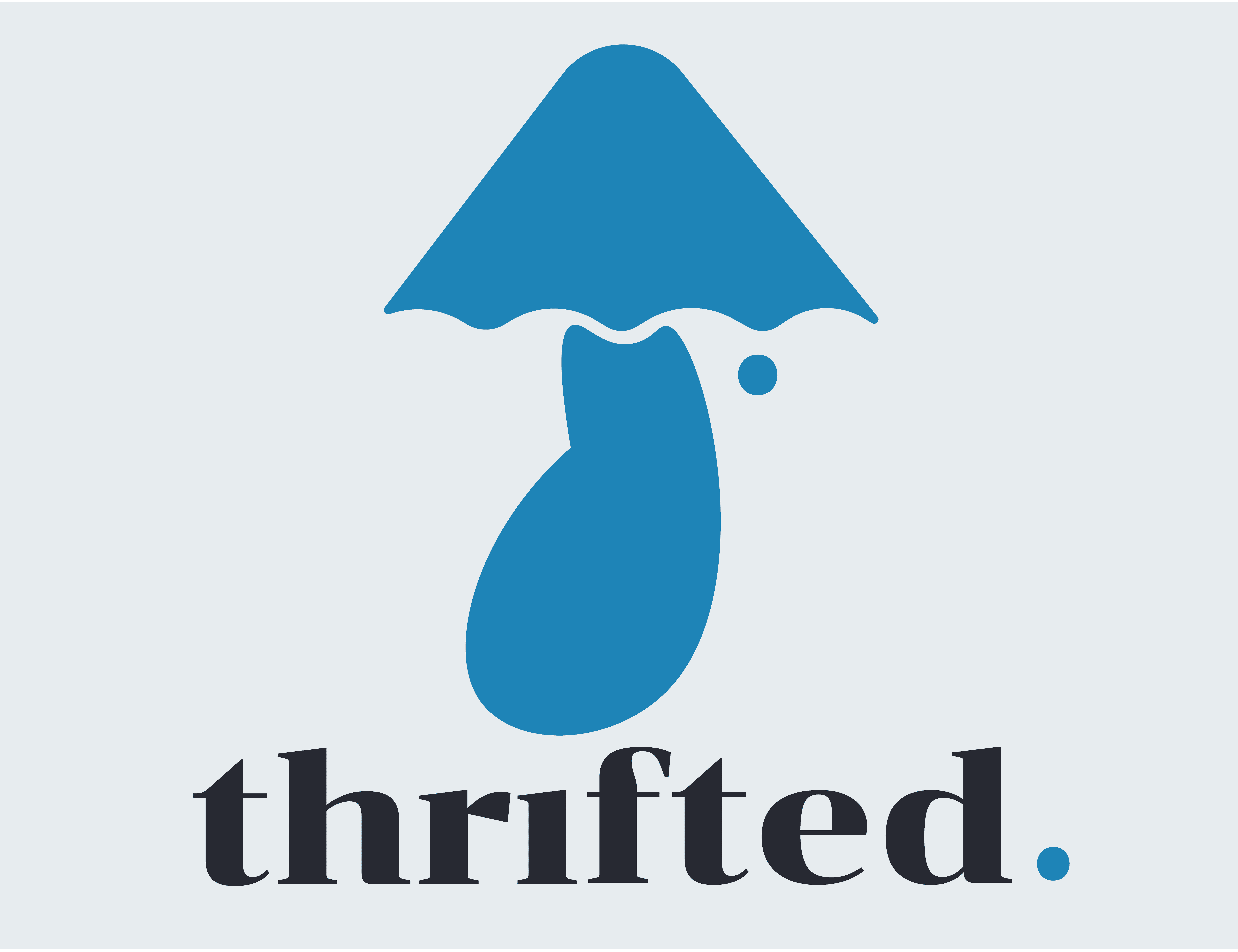 The logo combines the form of a mushroom with references to an umbrella and a lamp, symbolizing growth, protection, and illumination. This fluid shape reinforces the brand’s motif of sustainability, care, and thoughtful reuse, aligning visually with Thrifted’s values.